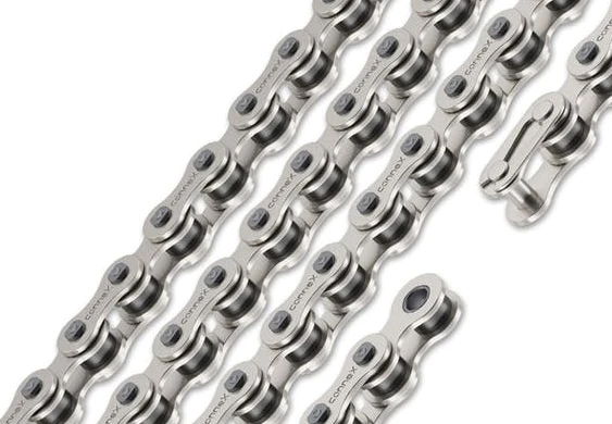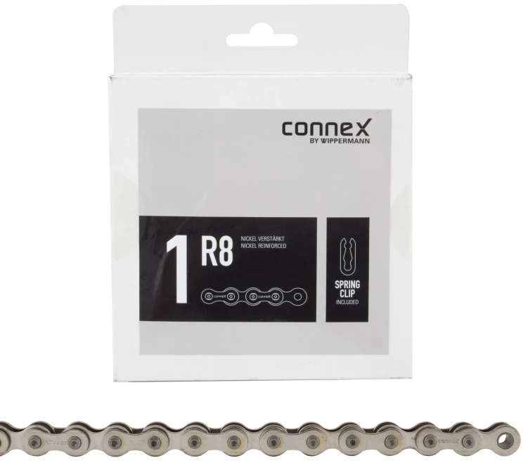 The Connex 1R8 Chain is a heavy duty chain perfect for most single speed applications. Features a high grad nickel coating to protect against corrosion.