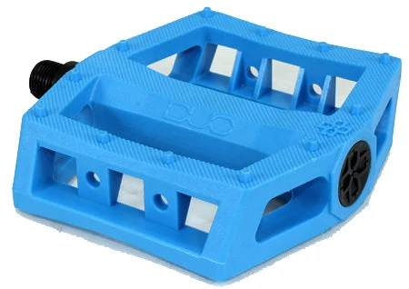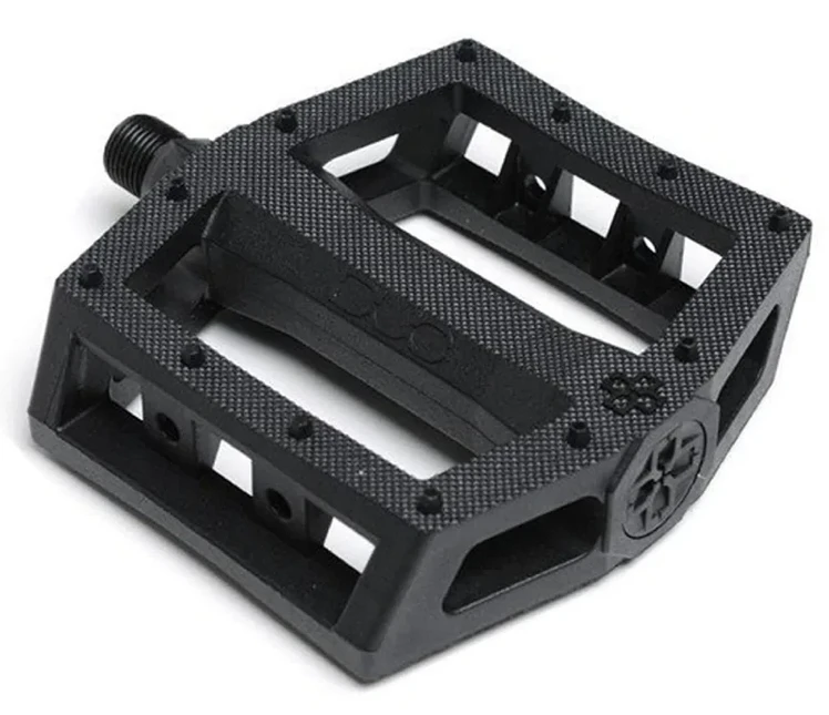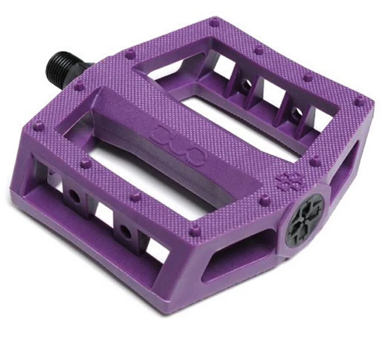 The Duo Resilite PC Pedals are a unique nylon/fiberglass composite material. This unique compound offer better traction while reducing the brittleness compared to a traditional PC pedal. Molded with 12 pins per side an a micro knurled concave surface for a great feel. Duo also threw in an extra set of white duo logo dust caps.