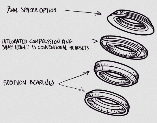 The Fly Volcano Headset is a sleek design that works a little different from other integrated headsets on the market. The new Volcano integrated headset comes with the integrated cone race system, that allows self-adjusting steering compression with just one single cap, using the top cap for both functions. The Volcano headset three different spacing options; 15mm, 7mm, an even a 0mm option for a super low profile look.