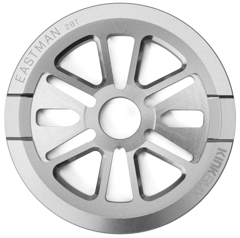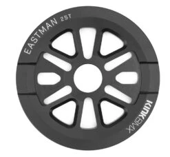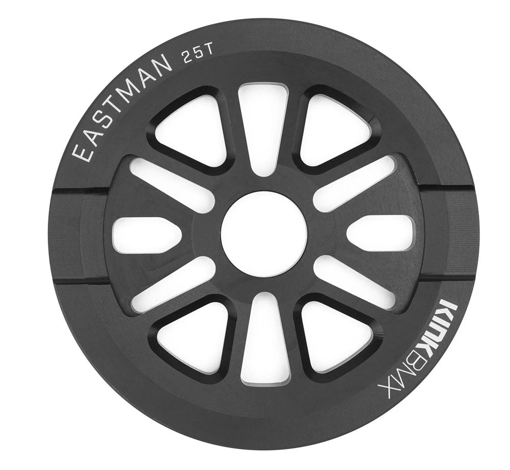 The Kink Eastman Guard Sprocket is made of 6061-T6 Aluminum and is fully CNC machined. The Eastman is a great BMX sprocket for those looking to do sprocket grand tricks or those that tend to break chains due to hitting them on ledges or rails. The Sprocket includes spaces so it will work with most BMX spindle sizes such as 19mm, 22mm and 24mm.