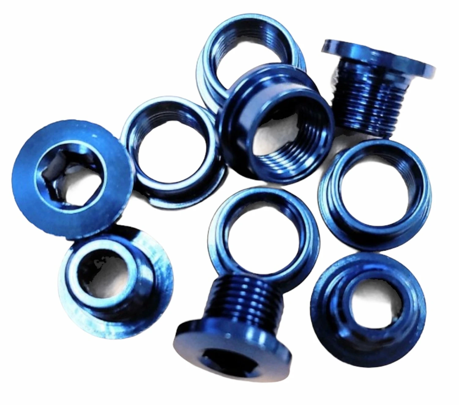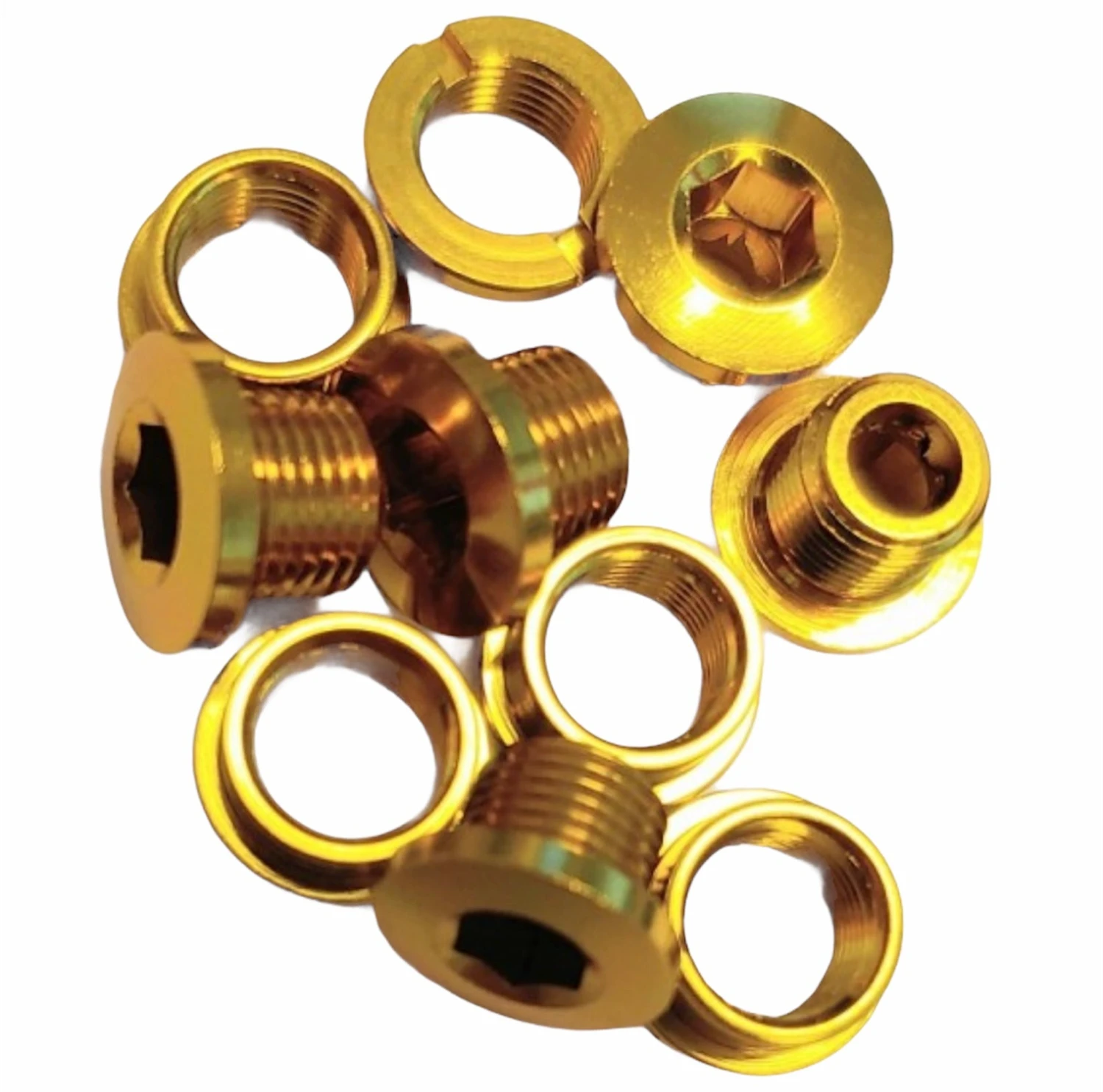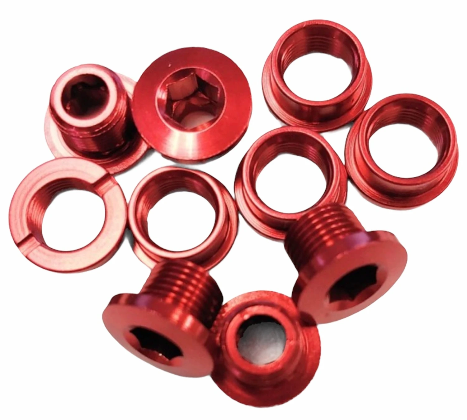 The MCS Single-ring Aluminum Chainring Bolts come in a set of 5 male/female bolts. The inside measures 4mm when tightened and have a 7mm total height.
