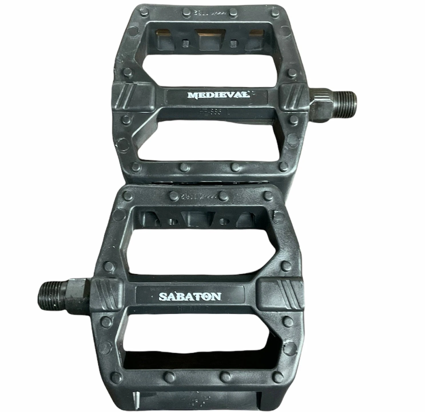 The Medieval Sabaton Pedals are a nylon composite body with a chromoly spindle to keep weight down and strength up. The PC bodies are concaved with 12 molded pins in each to increase traction.