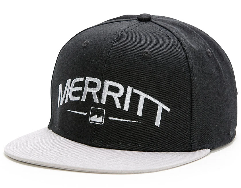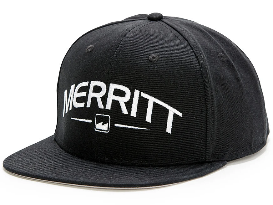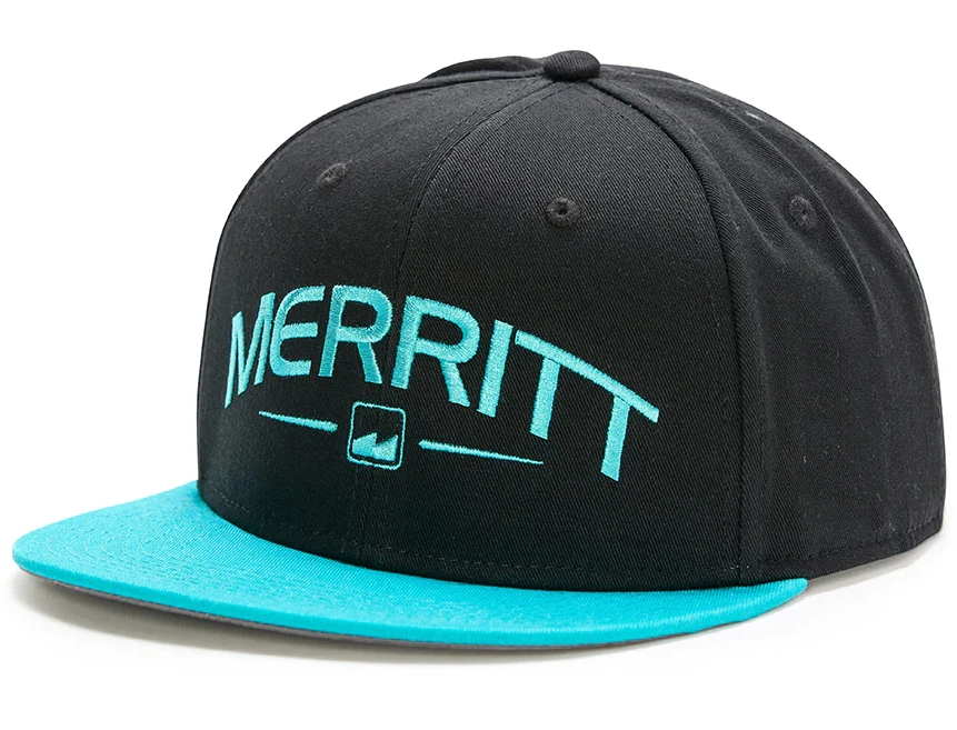 The Merritt Crispy Flat Brim Snapback Hat uses embroidered logos on a 6 panel snapback. High profile fit with a flat brim.