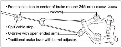 3. A brake boss to cable stop distance of 245mm, +10/-20. (measured from the center of the boss to the center of the cable stop).