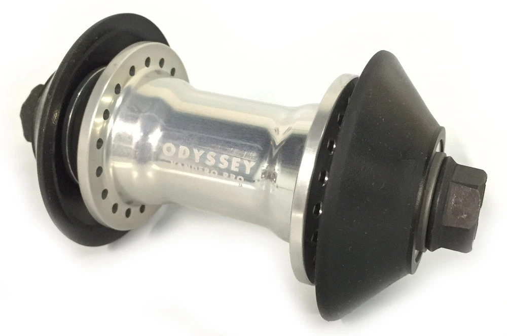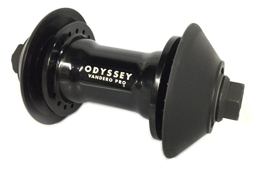 The Odyssey Vandero Pro Front Hub is made of 7075-T6 Aluminum and has oversized cartridge bearings for strength and drilled for 36 spokes. The inner axle is 7075 aluminum with steel helicoiled threads to accept the 3/8″ female axle bolts. The Vandero Pro was built to take a beating from whatever type of BMX riding you may throw at it and even includes two proprietary PC hub guards
