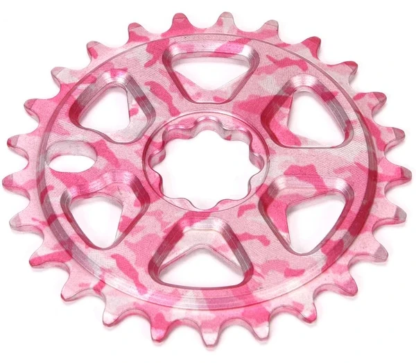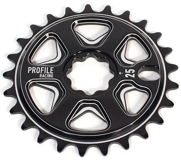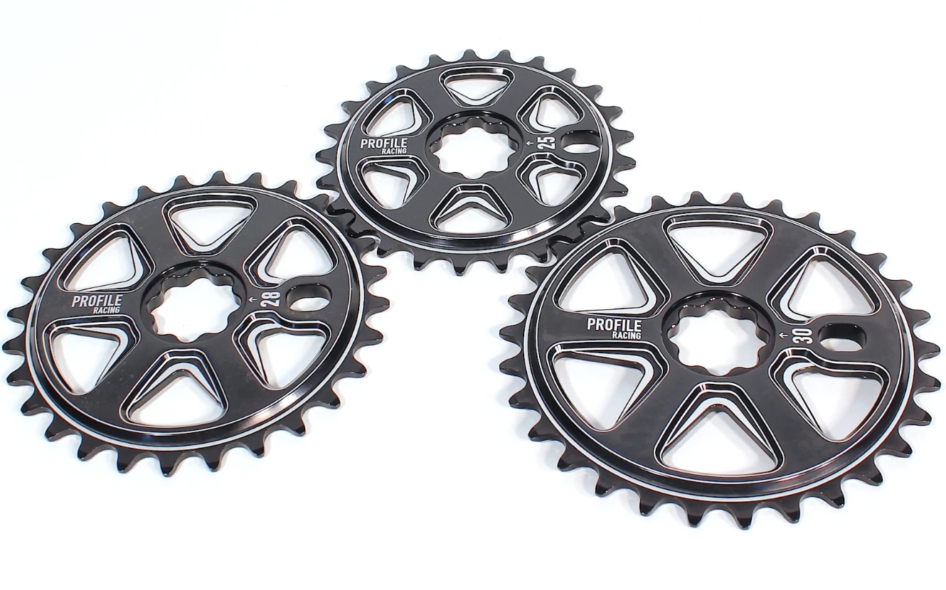 The Profile “Sabre” is a unique sprocket that takes a universal adapter insert making it work with both 19mm and 22mm bolt on and spline driven cranks.