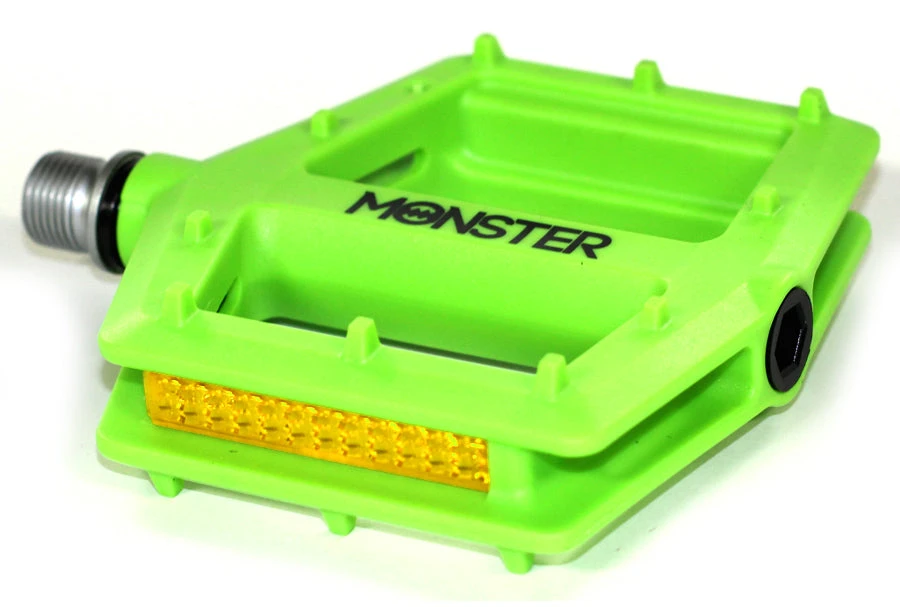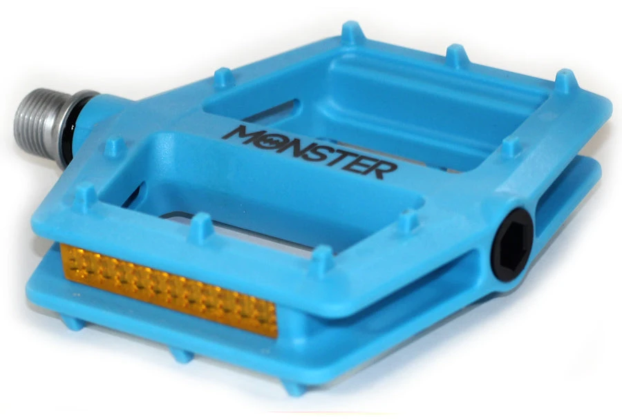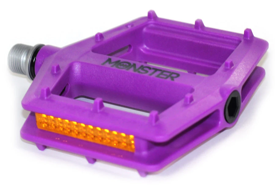 Redline Monster Pedals, sealed bearings, low profile, 5 colors available, CNC chromoly axle, removable reflector.Versatile, good looks, Low Profile Nylon body w/ten pins per side. CNC CrMo axle and sealed bearings meet the needs of hardcore riders that must have durability, and work for anyone who would like a stable and comfortable platform.