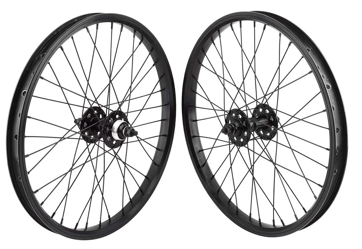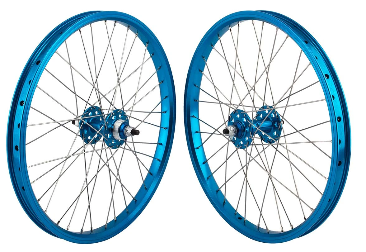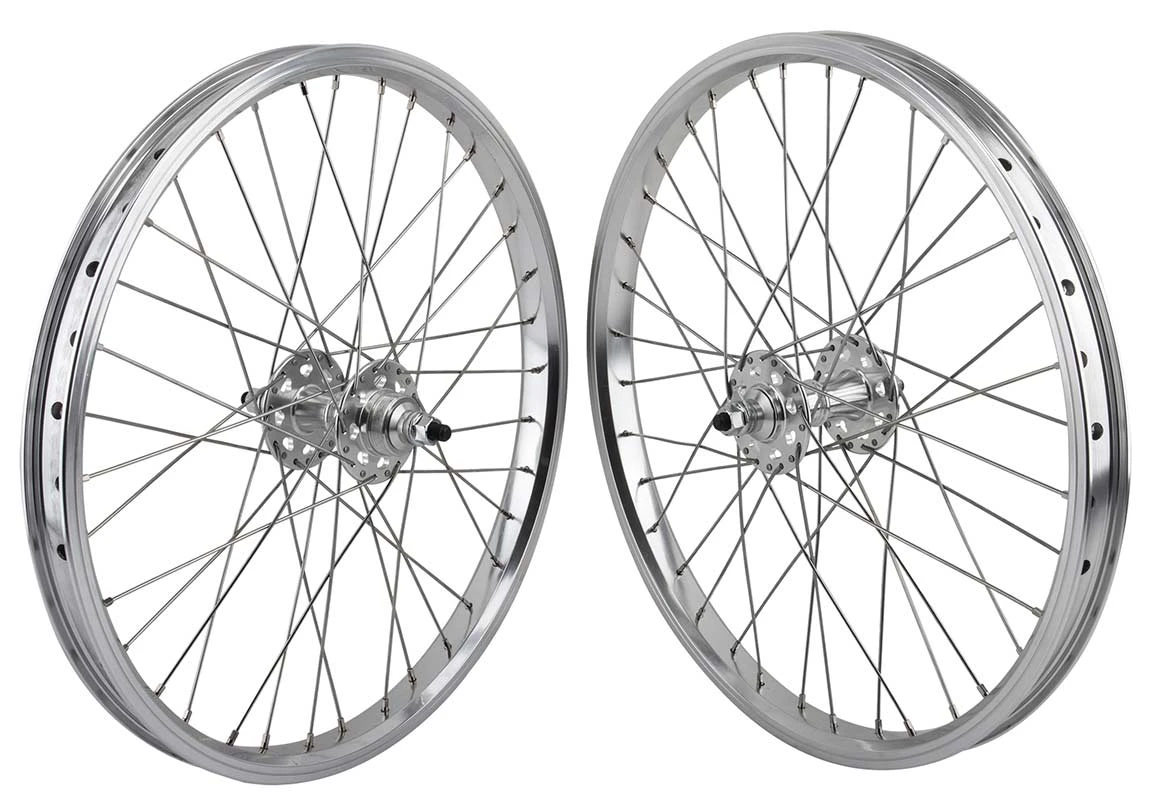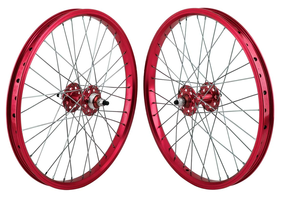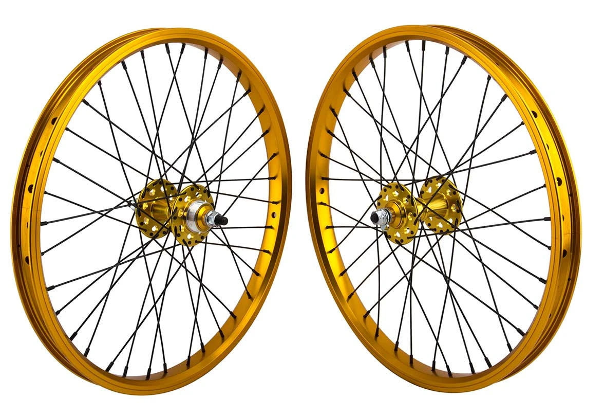 The SE Racing wheel set is a 20″ wheel set that was built to look very much like the old school wheel sets you’d find on so many of the BMX bikes from the 70’s and 80’s. SE Racing builds these wheels with a fully sealed hub set that uses a 3/8″ axle front and rear and is made to work 16t or larger freewheels. The rims are alloy double walled and come in a bunch of colors to match your build. This wheel set is killer for those looking to freshen up a retro bike. Remember that these wheels will NOT work on bikes that use 25t sprockets.