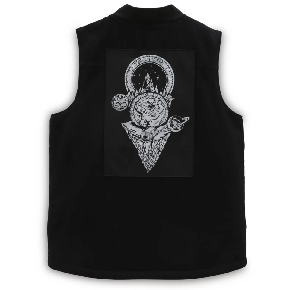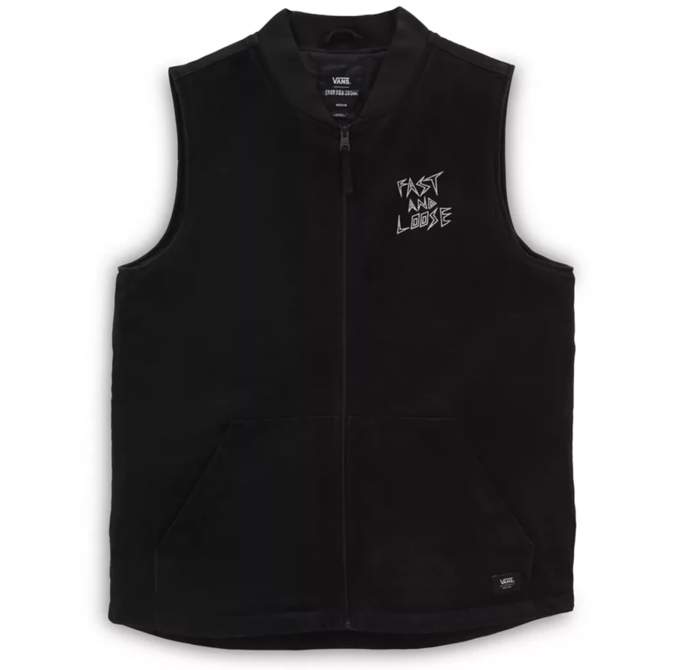 The Vans x Fast and Loose Denim Vest is constructed with a rigid denim for a structured look. Full zip design on the front. Embroidered patches on the left titty and back.